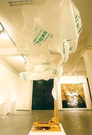 ゴミ袋で作られた煙の形が徐々に膨らんでゆく。横に5本の送電線の模型も並んでいる。